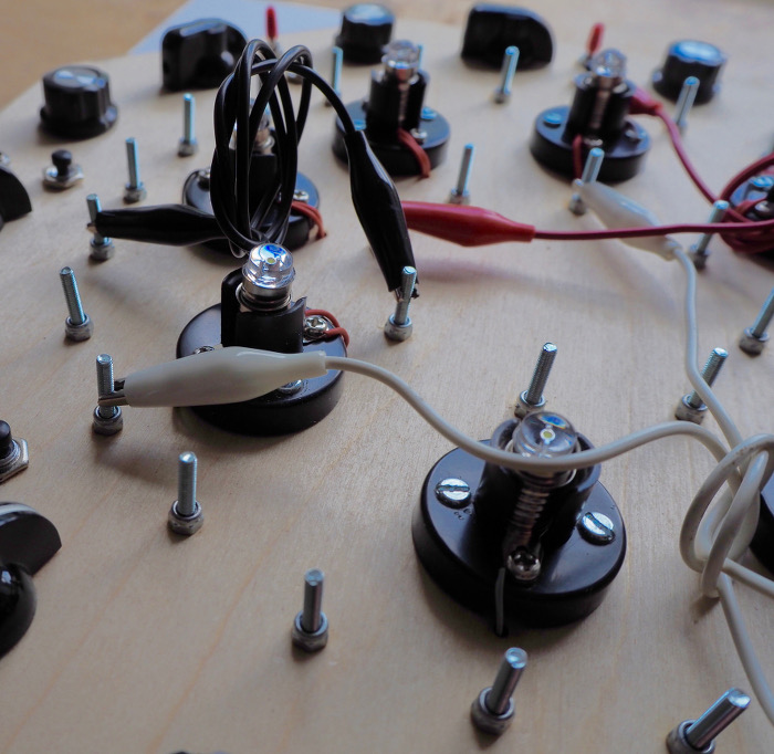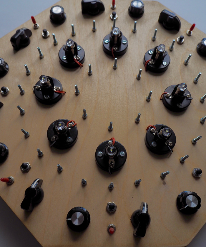 This is a physical interface for an 8 Neuron system. The lamps reflect each neuron's activation level while the control knobs adjust the neurons firing threshold and base excitation level. The red switch toggles the neuron's output effect between excitation and inhibition, and the push button stimulates the neuron.